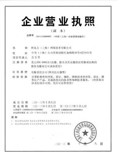 昨天,由4位温州商人投资的“阿礼尔(上海)网络技术有限公司”,拿到了中国(上海)自由贸易试验区实行“一口受理”制度后的第一张外资营业执照,核准号为“41000002201310090001”,注册资金300万美元。该公司也是拿到上海自贸区营业执照的首家网络企业。