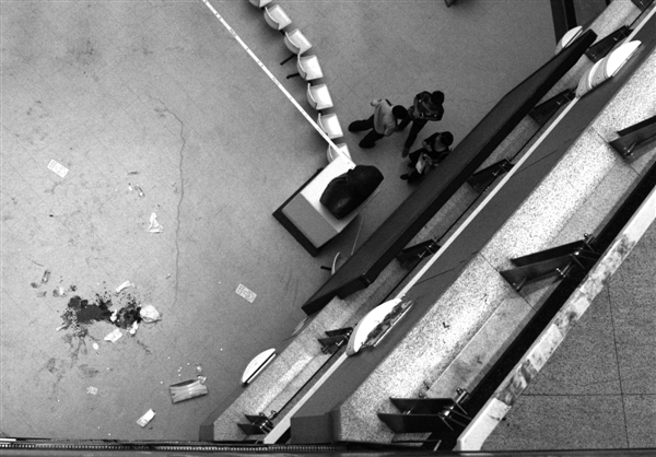人行电梯口处,一双女式塑料鞋仍摆放地上