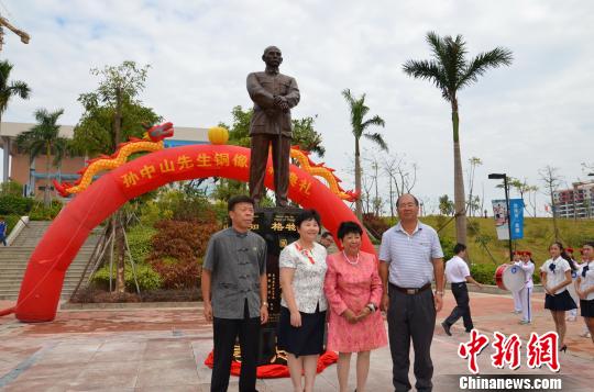 图为孙穗芳博士(右二)与惠州市人大常委会副主任华红(左二)、惠州市政协副主席廖锦堂(右一)、惠州市商贸旅游职业学院院长邓庆宁(左一)在刚刚揭幕的孙中山铜像前合影留念。 宋秀杰 摄