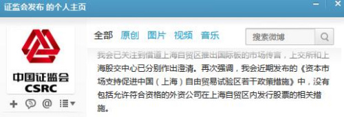 中新网10月16日电 据中国证监会办公厅新闻办官方微博消息,证监会今日在其微博对“上海自贸区推出国际板”的传言作出回应,称近期发布的《资本市场支持促进中国(上海)自由贸易试验区若干政策措施》中,没有包括允许符合资格的外资公司在上海自贸区内发行股票的相关措施。