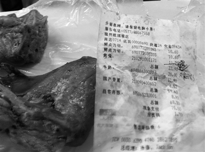 记者在沃尔玛欧洲城店购买了一只烤兔肉,现场工作人员将成品的兔肉装进简易的塑料袋中,除了产品单价、称重及总价等价格信息外,小标签上还明确标有产品名称、生产日期、配料表和保存条件和食用方法。