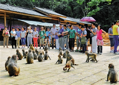 在文成县西部山区一个叫猴王谷的景区里,只要村民周加林的哨子一响,便有上百只猴子从山林中唰唰地奔下来,围着游人,“伸手”讨食,成为当地一景,十分有趣。
