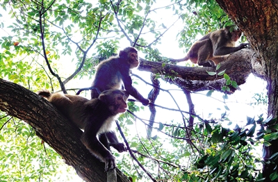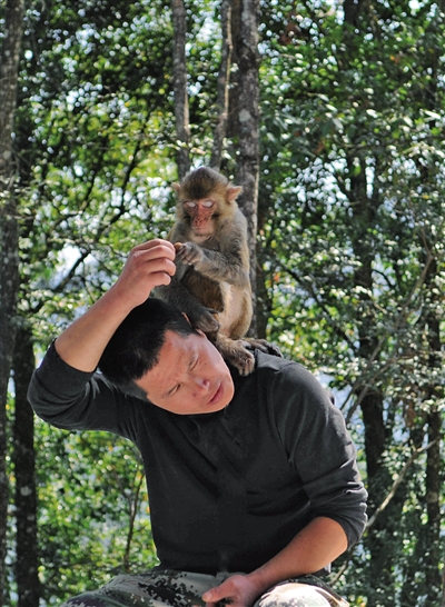 今年44岁的周加林,8岁就生活在这片山林中。在他的记忆里,从小就看过成群的猴子在林间树梢奔跑跳跃的场景,犹如狂风刮过搅得树林绿波起伏。猴子还与山民争食,他常与父亲一起驱赶猴群,防止庄稼被破坏。长大后,他成了林场的护林员。2008年,当地村民投资3000多万元,建设猴王谷景区,周加林又成了景区的驯猴师。
