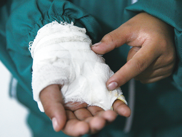 老师挥扫帚杆打学生小腿 学生右手一挡被伤缝九针