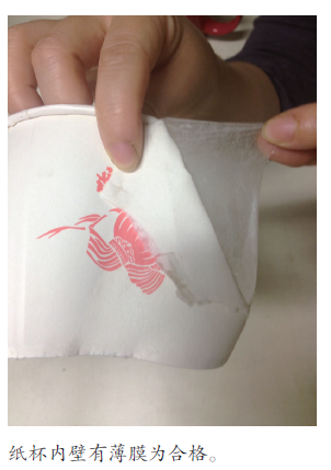 实验依据:纸杯端不起来、易变形,说明所用纸张质量差,挺度不够。纸杯有漏水或渗水情况也是不达标的,说明制作材料可能是回收的废纸或过湿的纸。