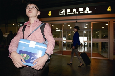 昨晚8时15分,武汉飞往温州的PN6235航班抵达龙湾国际机场,温州医科大学附属第一医院血液科医生甘一峰,怀抱着装有造血干细胞的转移箱,快步走出机场大门,乘车赶赴医院。