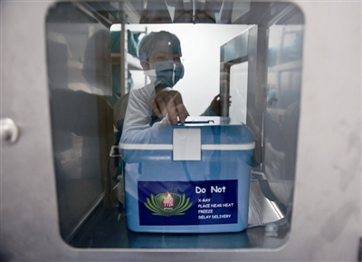 昨晚9时09分,装有造血干细胞悬液的骨髓转移箱进入传递仓。