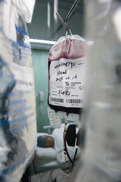 昨晚9时15分,在医院血液科干细胞移植病区,医生开始给文成小伙小胡注射330毫升的造血干细胞悬液。一个小时后,注射顺利结束。