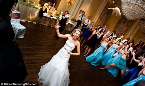 据外媒报道,在婚礼上接到新娘抛出的绣球常被视为感情生活得到祝福的预兆。然而,如果新娘抛出的不是花绣球,而是一只猫的时候,你还敢抢着去接么?