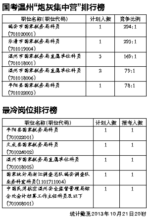 截至昨晚8时,2014年国家公务员考试录用系统数据显示,瑞安市国家税务局的“政策法规”一职,成为国考涉及温州的53个招录岗位中最受热捧的职位,294名审核合格的考生竞争1个职位;5个涉及温州的招录岗位均仅1人报考,成为最冷岗位(详见表格)。据悉,目前涉温国考岗位的平均竞争比例为40:1。国考报名将于后天下午6时截止。