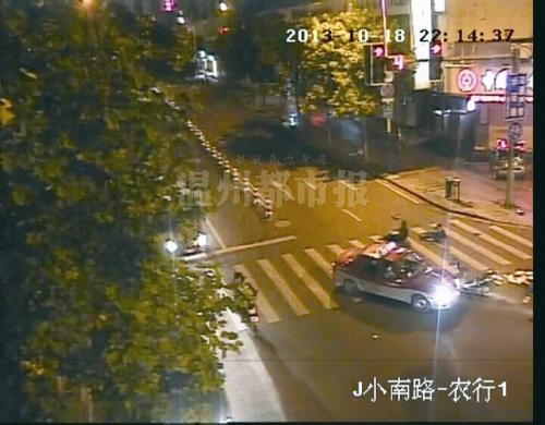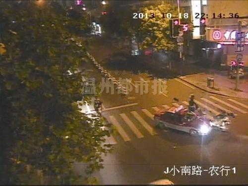 民警调取的现场监控录像显示:当天晚上10时14分许,刘某的出租车沿小南路自北向南行驶,行至路口后往荷花路左转弯,遇上对向由伍某驾驶的助力车,而助力车速度快得惊人,径直撞上出租车。在猛烈碰撞中,伍某和后座的男子双双腾空飞起,接着来了个接近360度的前空翻,再双双摔落在地上,整个过程不过两三秒。万幸的是,两人均是下身着地。其中,伍某落地很快起身,并走到自己的车前,扶起面目全非的助力车。