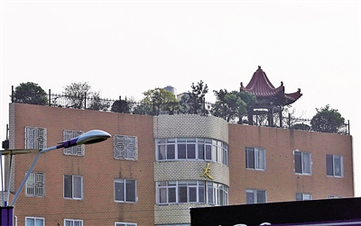 20年的老违建,历史算悠久吗?瑞安市上望街道就有一个:1994年,该街道林东村友谊大厦落成,9楼楼顶被改建成花园,其中一个飞檐状亭子矗立在楼顶,成为周边最高建筑物,非常醒目。昨天,有微博网友发帖:“继北京的楼顶花园之后,瑞安也惊现楼顶花园。”这则微博,引起了市民监督团的关注,昨天下午,记者随市民监督团前往实地查访。