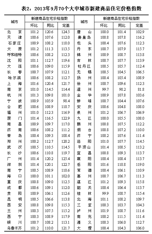国家统计局今日发布2013年9月份70个大中城市住宅销售价格变动情况。数据显示与上月相比,70个大中城市中新建商品住宅价格上涨的城市有65个。环比价格上涨的城市中泸州涨幅最高,为1.9%。与去年同月相比,70个大中城市中新建商品住宅价格下降的城市有1个,上涨的城市有69个,北京上涨幅度最高,为20.6%。