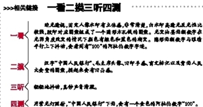 “市民在辨别钱币真假时,不能只看一处防伪特征,可将可疑纸币弯曲,仔细查找,一般可以发现拼接痕迹。另外,市民如收到可疑钞票,可到银行鉴定真伪。”我市某银行工作人员表示,无论伪造者的技术多高,假币永远也不会和真币完全一样,只要熟练掌握常用的“一看、二摸、三听、四测”鉴别法,就能有效地杜绝假币。