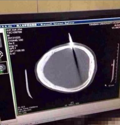 延边大学附属医院急诊科医生表示,这样的情形还是头一次见。“以前见过菜刀砍伤颅骨的,但是这么小的水果刀刺穿颅骨我还是第一次见到,好在伤口不深,应该不会影响到大脑功能。”