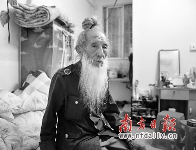 一尺多长的胡子有些枯黄,银灰色的发髻,布满皱纹的脸,瘦小的身躯,上身穿着军绿色的衬衫,胸前佩戴着他参战时获得的勋章。