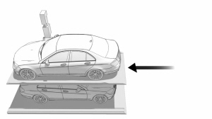 车子开上台板后台板垂直升起旋转90°,支柱将台板推入