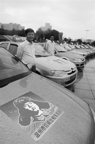 昨天下午,18辆出租车在世纪广场一字排开,准备上路服务。这些车辆虽与普通出租车无异,但车内、车外看起来异常整洁,有的车辆还经过改装,不仅有按摩靠背,还有环绕音响。记者注意到,每辆车上贴有“温州信威车队”标志,标志上印了一个雷锋头像。按照队员们的想法, “我们平时除了做生意,也会开展公益服务,比如对行动不方便的人提供市区内免费乘坐服务。”
