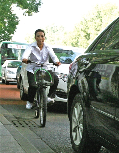 经常骑着自行车上班的音乐老师陈李雅对记者说,市区有不少路段都是在自行车道右侧划有停车位的,这样一来,本来就被“瘦身”的自行车道有时还有左侧的汽车挤进来,骑车的人常常会手足无措,简直像在夹缝中求生存。