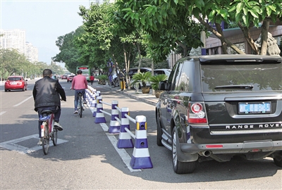 当天中午,记者骑车经过黎明路时,一辆黑色保时捷更是直接把车子停在了黎明立交桥路口的橙色铺装上,骑行者只能把自行车骑上了机动车道。“目前温州市区的问题是,由于汽车保有量增长迅速,停车难确实是个大问题,但这并不意味着汽车就可以霸占自行车道停车。”家住市区黎明西路的市民王丽看到此情景时说,她每天骑自行车去往车站大道上班。
