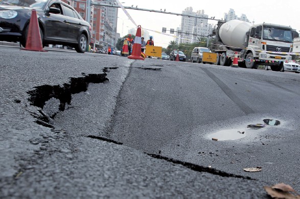 沉陷的路面距离斑马线仅几米,呈正方形,长、宽均约4米,四周出现数厘米宽的裂痕并向上翘起,留有车辆底盘被刮擦的痕迹。坑内高低不平,落差约40厘米。昨天下午3时许,事发路面四周围起了安全护栏,几名工人正在窨井下面进行抢修。