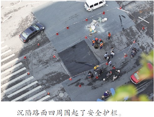 昨天下午,记者在现场看到,排水工作抢修人员正在窨井中进行抢修。现场工作人员介绍,沉陷与地下排污管道开裂有关。