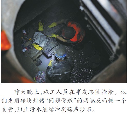 据现场施工管理人员介绍,昨天的抢修工作主要是用砖块封堵“问题管道”的两端及西侧一个支管,阻止污水继续冲刷路基沙石。今天,上海的一个专业维修队将到现场开展作业,用铜板、线圈等连接开裂的管道节点,再在节点外围注浆,起到密封作用。管道修复后,抢修人员会对这条管道进行大检查,如存在严重问题,将视情况向有关部门申请更换。