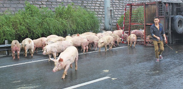 货车侧翻 60多只“二师兄”高速上散步