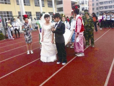 那么男新娘是怎么回事呢?该校教形象设计的陈老师告诉记者,这是化妆专业的学生,为了体现化妆的挑战性,故意男化女妆,女化男妆。学生们还设计了一个情景剧,里面有抢亲的环节,而演员全部是反串表演的。“同学们的这个创意,也得到了我们专业老师的指导。”