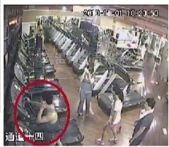 当陈女士摔倒后,上前帮助的一名男士按了一下肇事跑步机上的停止键(图中圆圈处)。“是不是当时这台跑步机出现了故障?”对于记者的猜测,在场的自称是百盛健身客户总监的洪先生没有予以正面回应。