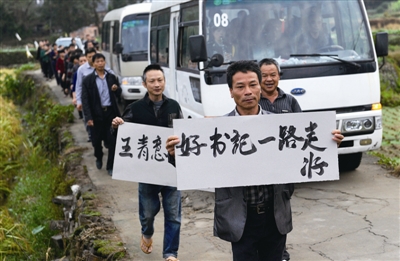 今天早上6点,带溪社区的王家推摆好前一天晚上准备好的纸板,用毛笔写了六张他对王青意的“追悼词”。写好之后,他和另外5名带溪社区村民便站在王青意灵车将经过的路口,举着纸板等待。王家推手上拿着的那张上面写着“好书记一路走好”。