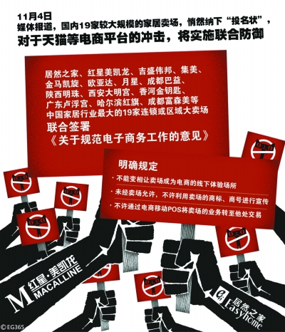 此举引起家居卖场的集体反弹。中国家居行业19家规模较大连锁或区域卖场——居然之家、红星美凯龙、吉盛伟邦、集美、金马凯旋、欧亚达、月星、成都巴益、陕西明珠、西安大明宫、香河金钥匙、广东卢浮宫、哈尔滨红旗、成都富森美等日前联合向入驻商家发文,明确“不能变相让卖场成为电商的线下体验场所,不能让经销商成为电商的线下搬运工。”