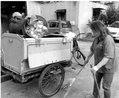 他们正在清运垃圾房里的垃圾,钟友苗不断地将一袋袋垃圾扔到车上,何小琴站在车旁,扫起掉落在车外的垃圾。
