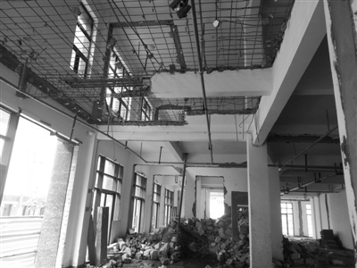 日前,记者在施工现场看到,现场一片狼藉,多处支撑房屋的减力墙、支柱等被拆除,部分二层的楼板也被拆掉,现场甚至还看到了一些被拆毁的消防管道和设施。