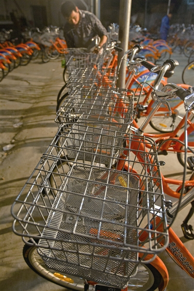 昨天晚上9时许,工作人员正在对这批新车的车篮进行调试(如图)。车篮的盖子为网格状,材质与车篮相同,均为经过防锈处理的铁筐。盖子前方有一个扣子,能紧紧扣住车篮。该服务中心一名负责人介绍,车篮加盖子主要为安全起见,市民可根据自己的需求在扣子处上锁,但在还车时务必要记得解锁。