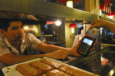 一市民在南浦农贸市场一熟食店用市民卡刷卡消费。徐晓春摄