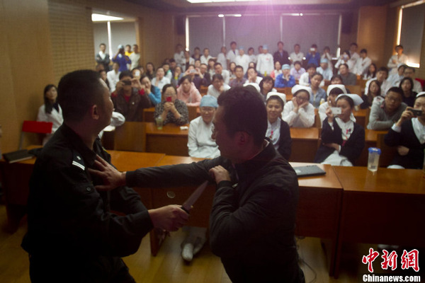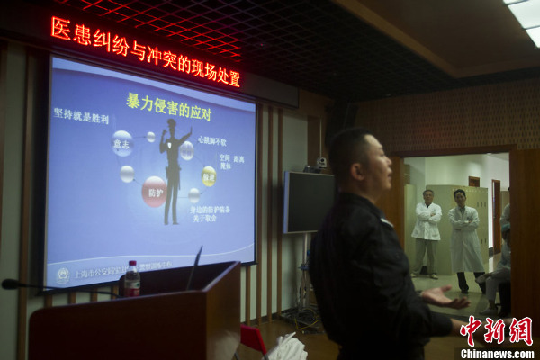 图为2013年11月5日,上海华山医院,宝山公安分局专职教官倪军在向医院职工培训面对暴力侵害时的正确自卫方法。<div>同日,中山医院也邀请世界跆拳道联盟黑带四段高手,前来传授防身绝招。实际上,从2005年以来,中国医院就开始设立警务室,但效果并不明显。医而忧则武,五味杂陈。图片来源:CFP视觉中国</div>