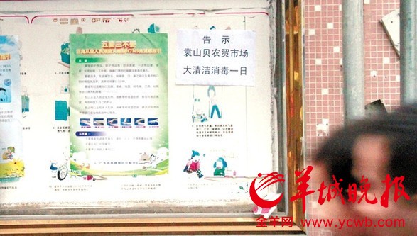 袁山贝市场在公告栏里贴出消毒的告示羊城晚报记者王俊伟摄
