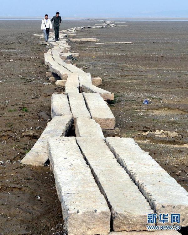 新华社照片,鄱阳湖(江西),2013年11月6日鄱阳湖持续逼近8米极枯水位致百余万人饮水受影响11月6日,游人行走在鄱阳湖底古石桥上。新华社记者宋振平摄