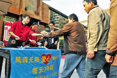 3时整,一张写着“风雨无阻,爱心粉干”字样的桌子在餐厅前铺开。热气腾腾的爱心粉干瞬间吸引了过路人的眼球,队伍一直从餐厅门口排到马路上。在附近打扫卫生的环卫工周师傅说,他从同伴口中得知这个消息,便决定来尝尝鲜。“味道真不错,这个店的老板做的是好事呀!”不善言辞的他说,希望吃完爱心粉干的人不要将塑料碗和筷子扔到大街上,保护环境卫生同样很重要。