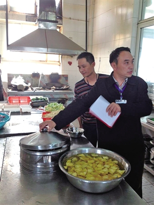 食堂操作区没有隔间,生熟未完全分离,天花板上的油渍已经发霉;没有排风设施,油烟滚滚;仓库区里,米、面、水果、冷藏品集中在一起,装箱的水果个别已腐烂。工作人员检查了台账,“大体符合规范,但部分进货单位不够详细,没有登记具体摊位。”群众监督员朱汉阳认为,学校硬件设施先天不足可以理解,但后期管理存在漏洞。“操作间清洗、物品存放检查应该责任落实到人,仓库环境需要定期清理。”
