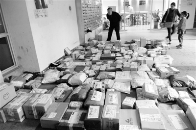 昨天下午4点左右,锦江家园物业办公室外面约400件包裹大面积铺开,还有快递人员陆陆续续送件过来。一名保安人员守着包裹,前来取件的住户要在包裹队伍里寻找。此外,楼梯口、办公室里都还有一堆。金鱼摄