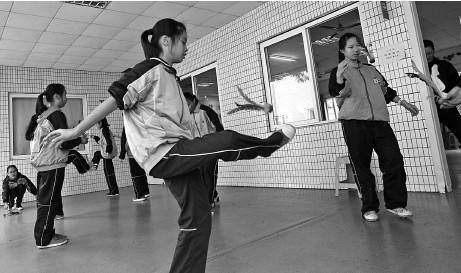 昨天上午,市区绣山中学八(16)班的同学在测试之前练习踢毽子。记者郑之越/摄