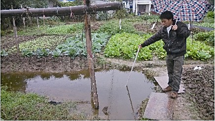 据了解,这个菜园平时一直有人在打理,水坑里的水是浇菜用的。雷先生用棍子测量了水坑的水深,最深处达一米多,而且这个水坑的边上既没有防护栏,也没有安全警示标志。雷先生说,他租的房子里有8户住户,每户都有小孩,这个水坑对孩子们是个威胁。他认为,“菜园的主人应当设立安全警示标志,设好防护栏,防止意外的发生。”