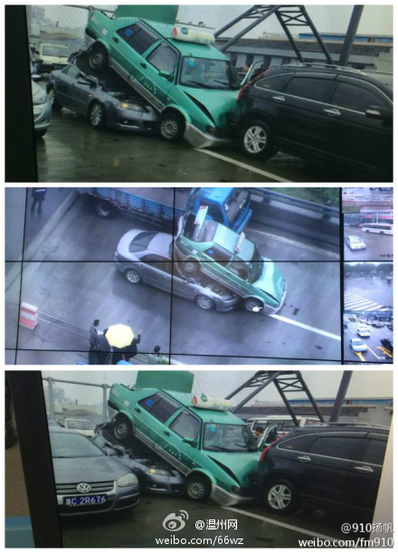 昨天上午,温州瑞安市飞云江大桥上发生一起三车追尾的交通事故。一辆马自达撞击一辆出租车尾部,将出租车顶到了其车顶上,出租车同时又撞上了前方的一辆越野车。事故造成飞云江大桥堵车严重,经过一个小时的紧张施救及疏通,现场交通才恢复畅通。