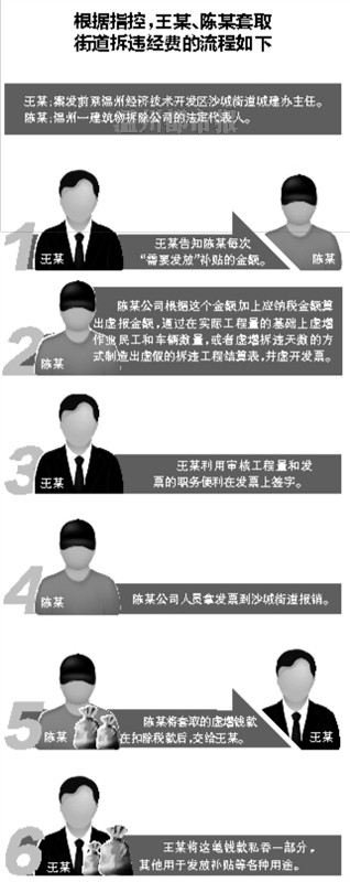 据公诉机关指控,2011年7月至今年3月,时任温州经济技术开发区沙城街道城建办主任的王某和陈某商量,预谋利用王某职务上的便利,共同骗取沙城街道拆违经费给城建办人员发放拆违补贴。据侦查机关查实,2011年7月至今年3月,王某、陈某等人采用这种方式,一共骗取沙城街道拆违经费32.8万余元。