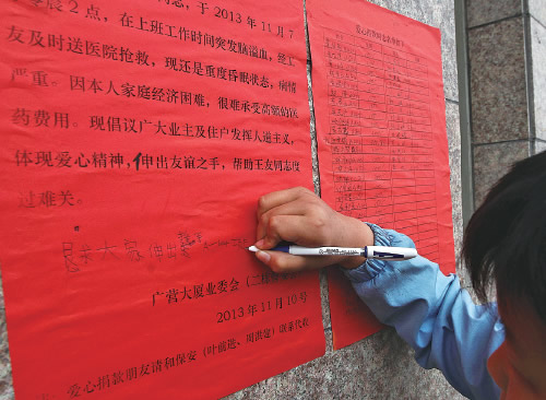 “大家都是主动捐款,即使微薄,也是对老王的一点心意。”广营大厦业委会主任吴龙洪说,短短两天时间,已经有几十位住户共捐款6000多元,目前募捐还在进行中,大家都希望尽可能帮助老王渡过难关。