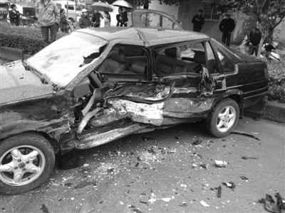 交警来到现场后,现场一片狼藉,黑色现代“四脚朝天”,与桑塔纳并排停在一起。现代车头和右车尾部位严重损坏,桑塔纳右侧两扇门被撞得严重变形,停靠在马路另一侧的奥迪,左车头大灯部位撞了个大窟窿。
