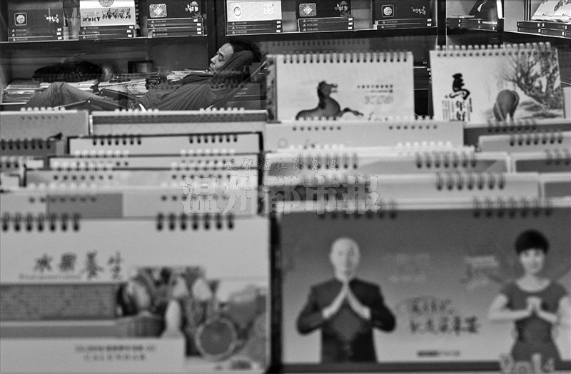 前天,在龙港礼品城一个批发台挂历的店内,老板躺在椅子上休息。老板说:“往年这个时候,我们都忙着做生意,根本没时间休息,现在是想忙都忙不起来。”受严禁公款购买贺卡、年历的影响,苍南台挂历企业业务量骤跌。温都记者王诚/摄