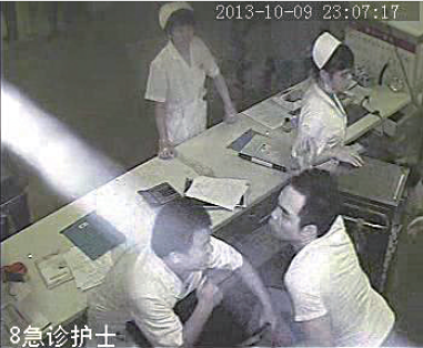据该医院的监控视频显示,当晚11时05分左右,10来名男子出现急诊室门口。